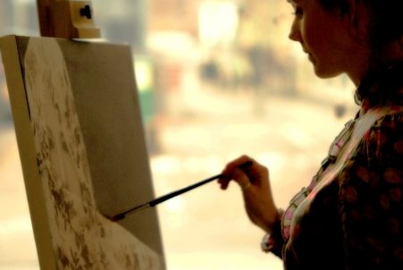 その光景に背を向け、彼女は絵に向かっています。背筋をピンと伸ばした姿勢にも、彼女の強い意志が現れているように感じます。