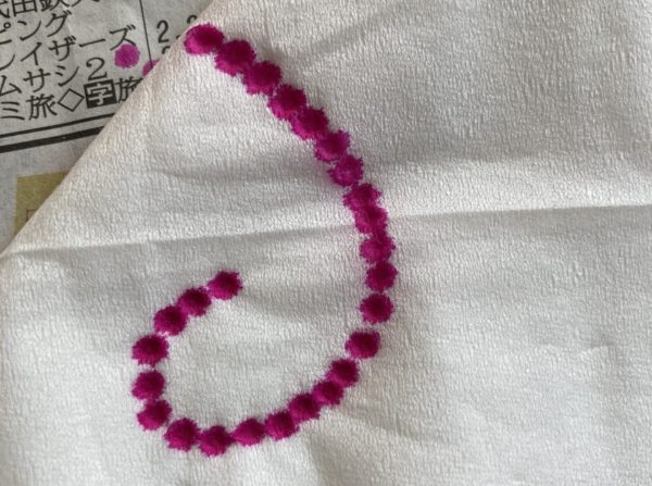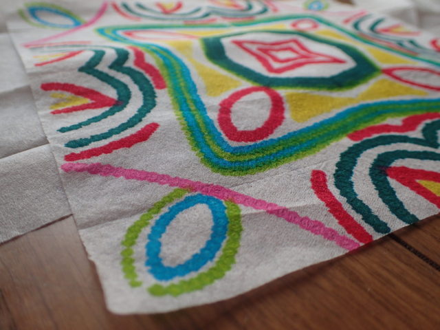 このとき、ハンコを押すような感じで、じっくりペン先を押し付けてくださいね。ティッシュの裏側までインクが浸透するよう、あわてずゆっくりと。