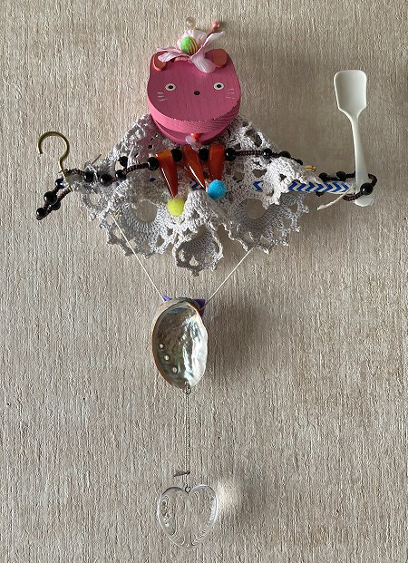 捨てようとしていたカスタネットやネックレスなどを組み合わせたもので、「つくった」というよりも、並べて合わせて遊んでいるうちに「勝手に生まれてきた」という感覚です。