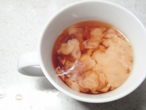 ミルクが、紅茶の底に沈み、モヤモヤと浮き上がってきます。ミルクが紅茶の中で渦模様を作り出す様子を、眺めましょう。